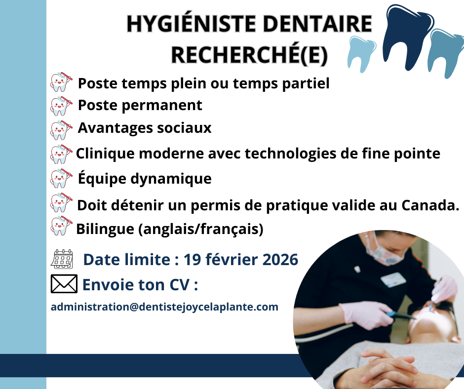 Vous pouvez envoyer votre CV à: administration@dentistejoycelaplante.com avant le 19 février 2026.